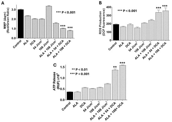 PDT-DCA disrupts mitochondrial membrane potential (MMP), elevates reactive oxygen species (ROS) production, and induces ATP release in PANC-1 cells. Cells were seeded in 96-well plates at 2 × 103 cells/well and cultured for 24 h at 37 °C to form monolayers. Treatments included (i) 5-ALA only (1.0 mM) for 4 h, PBS wash, and incubation continued for an additional 24 h in fresh DMEM; (ii) DCA only (30 mM for 24 h); (iii) 635 nm infrared laser only at 54 or 108 J/cm2); (iv) 5-ALA + DCA (1.0 mM 5-ALA for 4 h, PBS wash, and then 30 mM DCA for 24 h without irradiation); and (v) PDT-DCA (1.0 mM 5-ALA for 4 h, followed by laser irradiation at 54 or 108 J/cm2, and then 30 mM DCA for 24 h). Untreated cells served as controls. Post-treatment, cells were assessed as follows: (A) MMP (Δψm) was determined using JC-1 staining (30 min at 37 °C), with depolarization being reflected by reduced red-to-green fluorescence ratio (measured via fluorescence plate reader). (B) Intracellular ROS production measured using 10 μM DCFH-DA staining (90 min in the dark), with fluorescence being quantified (excitation/emission: 485/535 nm) using a microplate reader post-wash. (C) Extracellular ATP was measured via bioluminescence assay (marker of ICD), interpolated from an ATP standard curve. Data represent means ± SE from three independent experiments, each performed in quadruplicate. Asterisks denote significant differences compared with the control.
