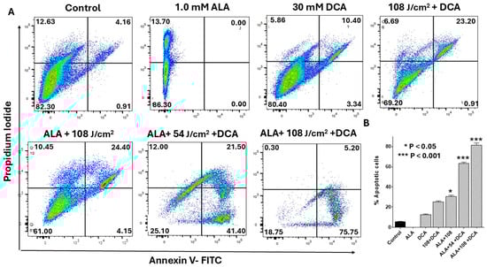 Flow cytometry analysis of synergistic effects of PDT-DCA on apoptosis. PANC-1 cells were seeded in 6-well plates at a density of 6.0 × 105 cells/well in complete DMEM and grown for 24 h at 37 °C to form monolayers. Cells were then incubated with 1.0 mM 5-ALA for 4 h, irradiated (635 nm laser at 54 or 108 J/cm2), and treated with 30 mM DCA for 24 h as described in the Methods Section. Controls and single-agent treatment groups were included. (A) Representative scatter plots illustrate dose-dependent apoptotic shifts (early: Annexin V-positive/PI-negative, lower right quadrant; late: Annexin V-positive/PI-positive, upper right quadrant). With 108 J/cm2 PDT, DCA elevated total apoptosis from ~25% (PDT alone) to ~80% (>3-fold increase), highlighting marked synergy. (B) Data in bar graph represent means ± SE from three independent experiments, each performed in triplicate. A Student’s t-test was used to determine statistically significant differences between control and experimental values. Asterisks denote significant differences compared with the control.