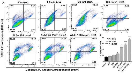 Flow cytometric analysis of PDT-DCA-induced caspase-3/-7 activation. PANC-1 cells were seeded in 6-well plates at a density of 6.0 × 105 cells/well in complete DMEM and grown for 24 h at 37 °C to form monolayers. Cells were then subjected to (PDT + DCA) combination therapy as follows: Cells were treated with 1.0 mM 5-ALA for 4 h at 37 °C, followed by laser irradiation at fluences of 54 or 108 J/cm2. After irradiation, cells were washed with PBS and treated with 30 mM DCA for an additional 24 h. Control groups were treated with laser or DCA alone, or with ALA and DCA only. (A) Caspase-3/-7 activation was measured by a flow cytometry method using CellEvent™ Caspase-3/7 Green Detection Reagent and SYTOX™ Advanced Dead Cell Stain as described in the Materials and Methods Section. Histograms shown are representative of three independent experiments performed in triplicate. (B) Data in bar graph represent means ± SE from three independent experiments, each performed in triplicate. A Student’s t-test was used to determine statistically significant differences between control and experimental values. Asterisks denote significant differences compared with the control.