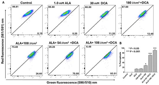Ferroptosis constitutes an iron-dependent regulated cell death modality defined by lipid peroxide accumulation, arising from iron-catalyzed peroxidation of polyunsaturated fatty acids (PUFAs) in cellular membranes, which culminates in membrane rupture [22]. Mitochondria are integral to ferroptosis execution, amplifying oxidative stress through reactive oxygen species (ROS) and lipid radical propagation. Given that PDT and DCA independently evoke ferroptosis and given our prior evidence of mitochondrial involvement in their synergy, we hypothesized that PDT-DCA would elicit mitochondria-driven ferroptosis in PANC-1 cells. Ferroptosis was quantified by flow cytometry detection of lipid peroxidation using BODIPY 581/591 C11, distinguishing non-oxidized (red fluorescence) from peroxidized (green fluorescence) lipids. Flow cytometry analysis revealed negligible ferroptosis induction with single agents (DCA or 5-ALA alone) relative to untreated controls (Figure 9A). Dual 5-ALA-DCA and laser–DCA combinations modestly elevated ferroptosis to 12.4% and 28.6%, respectively. Strikingly, PDT-DCA synergistically induced ferroptosis in 72.8% of cells at 54 J/cm2 laser fluence, escalating to 96.5% at 108 J/cm2.