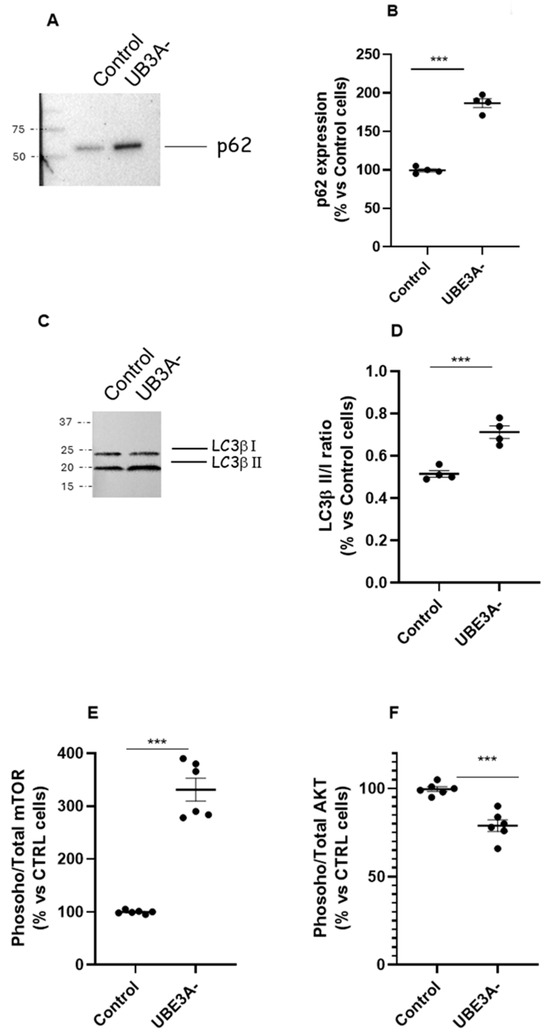 Autophagy and mTOR/AKT pathway in AS neuronal cells’ model. (A–D) Cell lysates from control and UBE3A− SH-SY5Y cells were used for western blotting analysis using specific antibodies to monitor autophagy activation, i.e., p62 (panel A) and LC3b (I and II, panel C). A ‘stain-free protein normalization’ method was used for the normalization of bands to total protein in blots, eliminating the need for housekeeping proteins. The data are expressed as % vs. control cells (for p62) and as ratio LC3b II/LC3b I, and represent the mean ± SEM of four independent experiments. Comparisons between control and UB3A− were performed using an unpaired two-tailed Student’s t-test; *** p < 0.001. (E,F) SH-SY5Y (control and UBE3A− cells) were fixed, and specific antibodies (total mTOR and phospho-mTOR, (panel E); total AKT or phospho-AKT, (panel F)) were used in specific immunoezymatic assays, as reported in Section 4. The data are expressed as the ratio between phosphorylated and total protein levels (in % vs. control cells) and represent the mean ± SEM of at four independent experiments. Comparisons between control and UBE3A− were performed using an unpaired two-tailed Student’s t-test; *** p < 0.001 vs. control cells.