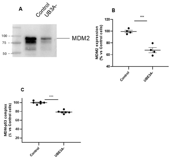 MDM2–p53 axis in the AS neuronal cell model. (A,B) Cell lysates from control and UBE3A− SH-SY5Y cells were used for western blotting analysis using specific antibodies to MDM2. A ‘stain-free protein normalization’ method was used for the normalization of bands to total protein in blots, eliminating the need for housekeeping proteins. (C) Cell lysates from control and UBE3A− SH-SY5Y cells were used to detect MDM2-p53 complex by a specific immunoezymatic assay, as reported in the Section 4. Data are expressed as percentage versus control cells and are mean ± SEM from four independent experiments. Comparisons between control and UBE3A− were performed using an unpaired two-tailed Student’s t-test; *** p < 0.001 control vs. UBE3A−.