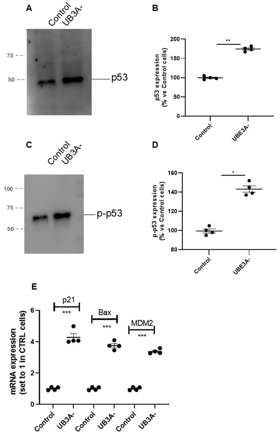 Moreover, the expression of the total levels of p53 was increased in UBE3A− cells (Figure 3A,B), and accordingly, the level of phosphorylated p53 (i.e, the active form of the oncoprotein) was significantly augmented in UBE3A− cells (Figure 3C,D).