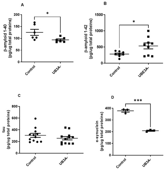 In our hands, cells deficient for UBE3A presented significantly lower levels of the shorter form of Amyloid-β (Aβ) protein (i.e., Aβ1-40) and higher levels of Aβ1-42, with respect to control cells (Figure 4A,B). Similar results were also evidenced in cortexes of adult AS mice with respect to their WT littermates (Supplementary Figure S2A,B). In contrast, oligomeric α-synuclein (α-syn) levels were significantly reduced in both UBE3A− SH-SY5Y cells and murine AS cortex lysates (Figure 4C and Supplementary Figure S2C). Finally, similar tau levels were evidenced in control and UBE3A− samples, both in SH-SY5Y cells (Figure 4D) and the murine brain cortex (Supplementary Figure S2D). Overall, these data indicate the presence of different levels and processing of misfolded proteins in UBE3A− neuronal cells.