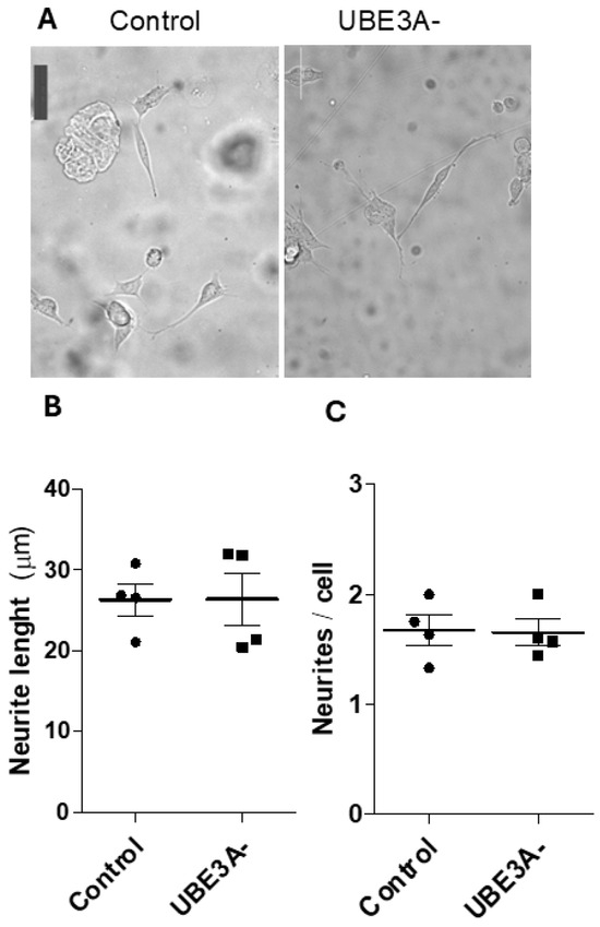 Morphological changes of AS cellular model. (A) Bright-field images of control and UBE3A− SH-SY5Y cells cultured for 24 h on standard culture plates; scale bars = 50 μm. The mean neurite length (µm) (panel B) and number of neurites/cell (panel C) were measured in control and UBE3A− SHSY5Y cells, as reported in the Methods section (mean ± SEM of N = 3 independent experiments performed in duplicate).