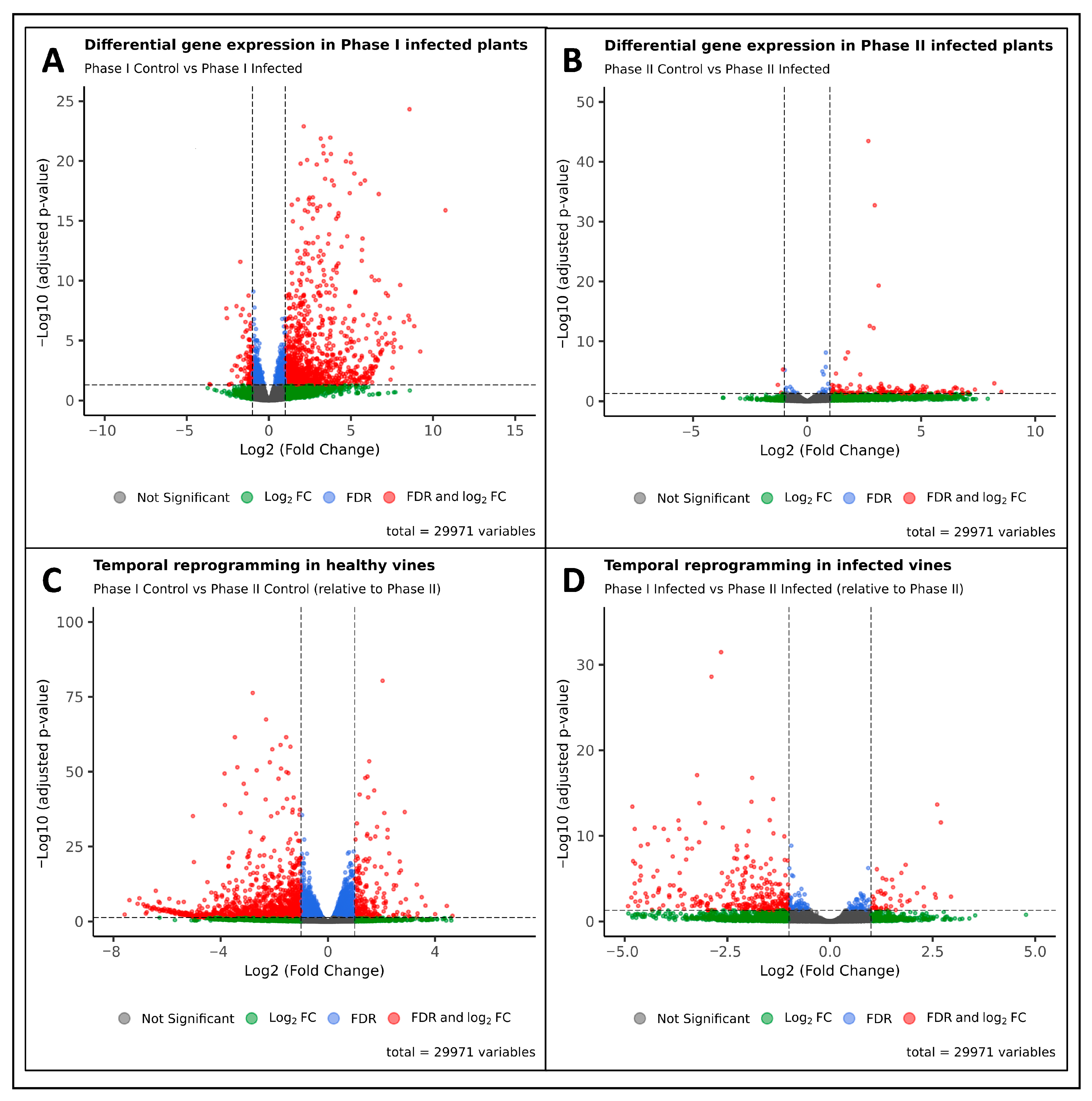 6]. In our re-analysis, 1093 DEGs (986 upregulated) were detected in Phase I infected vines, indicating strong transcriptional reprogramming. In contrast, only 136 DEGs were detected in Phase II, indicating a marked decline in transcriptional activity as the disease progresses. These results remain broadly consistent with the expression patterns reported by Ingel et al. (2021) [