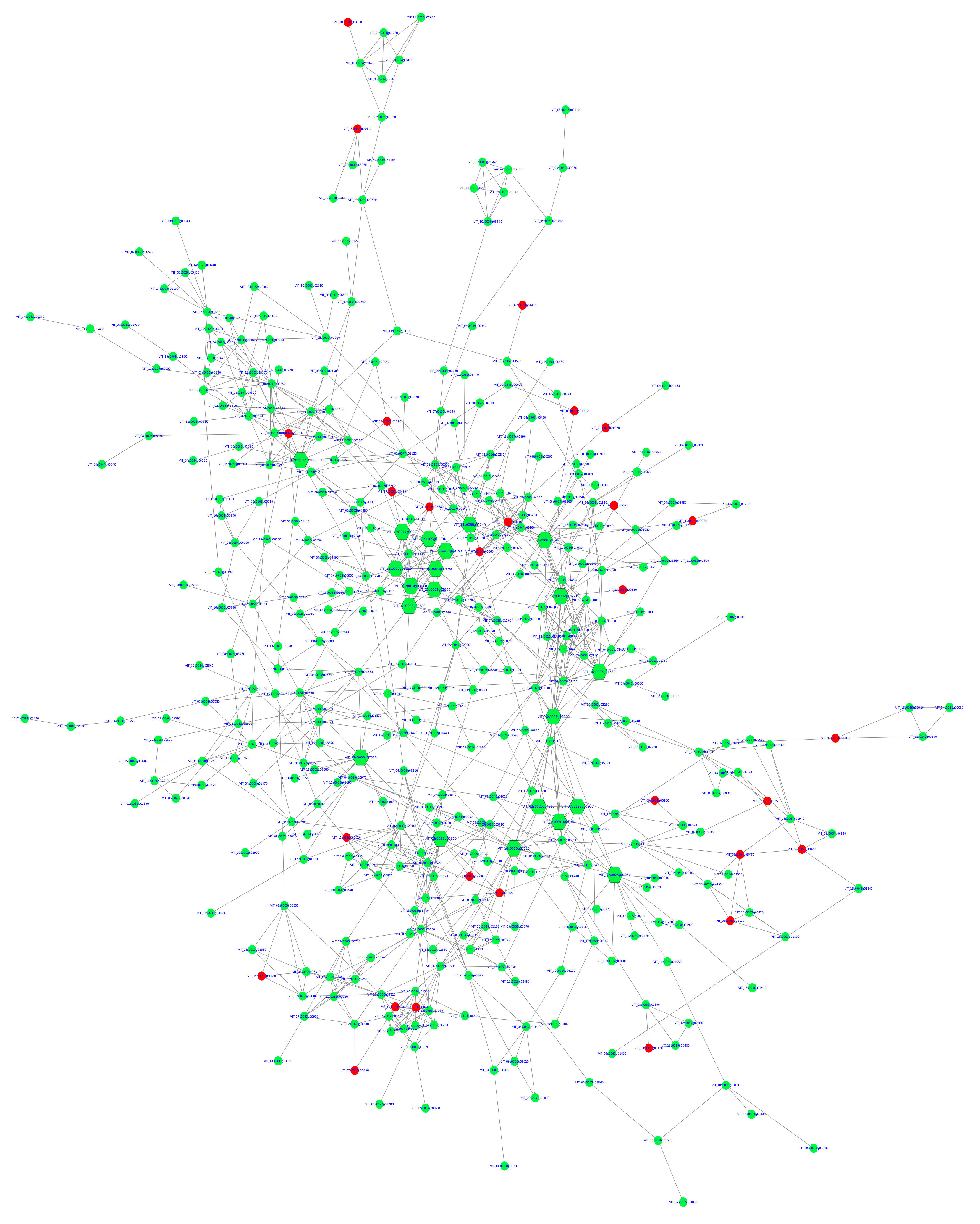 Supplementary Material II-iii). Cluster 2 showed the highest complexity, with a cluster score of 5.804, encompassing 148 nodes, and a density of 52. This cluster contained three seed genes (VIT-16s0050g01160, VIT-16s0098g01580, and VIT-04s0044g00860) and eight hub genes (VIT-16s0050g02220, VIT-18s001g14500, VIT-02s0025g04250, VIT-18s0001g03910, VIT-10s0115g01650, VIT-02s0025g04310, VIT-03s0091g00160, and VIT-07s0129g00360), among which one gene, VIT-16s0098g01580, functioned as a hub and seed node (