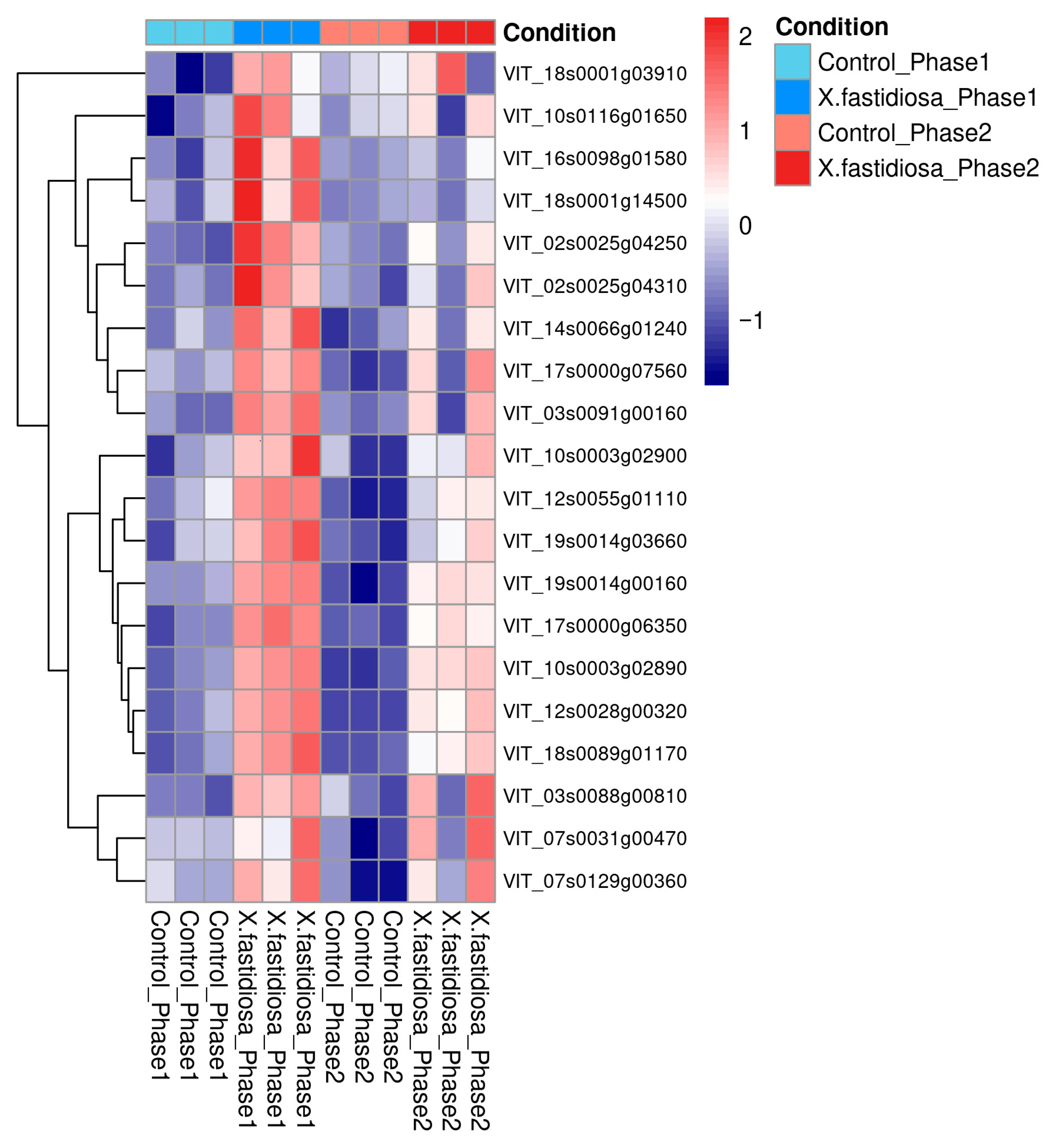 V. vinifera, we analyzed RNA-seq data from the Gene Expression Omnibus (GEO) dataset GSE152164, comprising 12 samples across Phases I and II under both control and infected conditions [