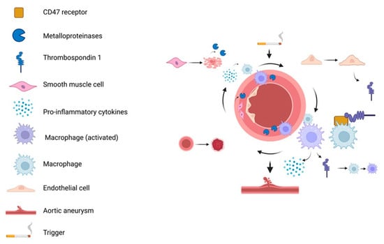The central focus of this article is the pathophysiological role of thrombospondin-1 (TSP1) and its receptor CD47 in AAA development. The TSP1–CD47 signaling axis has emerged as a critical upstream modulator of vascular inflammation. Through its effects on immune cell survival and efferocytosis, this interaction promotes sustained macrophage activation and persistent inflammation within the aneurysmal wall. Elucidating the molecular mechanisms underpinning the TSP1–CD47 axis is essential for advancing our understanding of AAA pathobiology and developing targeted therapeutic strategies. A hallmark feature of AAA pathogenesis is the presence of a self-sustaining inflammatory loop, which perpetuates tissue injury and ECM degradation. This phenomenon, and its molecular underpinnings, are discussed in detail in subsequent sections of this article.