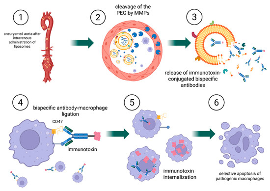Mechanism of targeted CD47-directed immunoliposome delivery and macrophage elimination. 1. Following intravenous administration, PEGylated, MMP-responsive immunoliposomes circulate systemically and reach the AAA tissue, characterized by local overexpression of MMPs; 2. At the disease site, MMPs cleave the peptide linker, removing the PEG coating and exposing macrophage-targeting ligands; 3. Liposomal destabilization results in the release of immunotoxin-conjugated bispecific antibodies, which diffuse into the affected tissue; 4. Bispecific antibodies bind selectively to macrophage surface receptors, including CD47 and a macrophage-specific antigen; 5. Immunotoxins are internalized via endocytosis; 6. Lysosomal degradation releases the immunotoxin intracellularly, inducing selective apoptosis of pathogenic macrophages. Created in BioRender. Janas, K. (2025) https://BioRender.com/pvm1g30 (accessed on 2 November 2025).