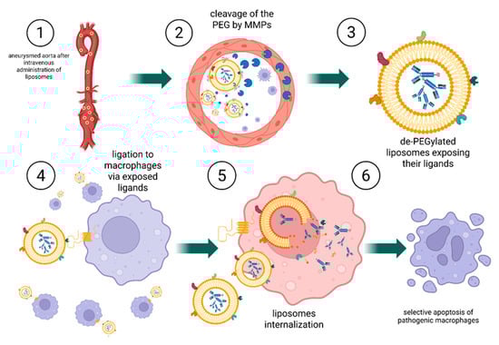 Mechanism of targeted CD47-directed immunoliposome delivery and macrophage elimination. 1. Following intravenous administration, PEGylated, MMP-responsive immunoliposomes circulate through the bloodstream including AAA tissue, where MMPs are locally overexpressed; 2. At the disease site, MMPs cleave the peptide linker, resulting in PEG shedding and exposure macrophage-targeting ligands on the liposomal surface; 3. A crucial distinction occurs at this stage: liposomes with exposed ligands are now capable of binding to nearby macrophages; 4. Immunoliposomes bind to CD47 receptors on the macrophage surface via the exposed targeting ligands; 5. The bound liposomes are internalized through endocytosis and subsequently undergo intracellular disassembly; 6. Lysosomal degradation of the liposomes leads to the release of the immunotoxin, inducing selective apoptosis of macrophages. Created in BioRender. Janas, K. (2025) https://BioRender.com/bsxk4dn (accessed on 3 November 2025).