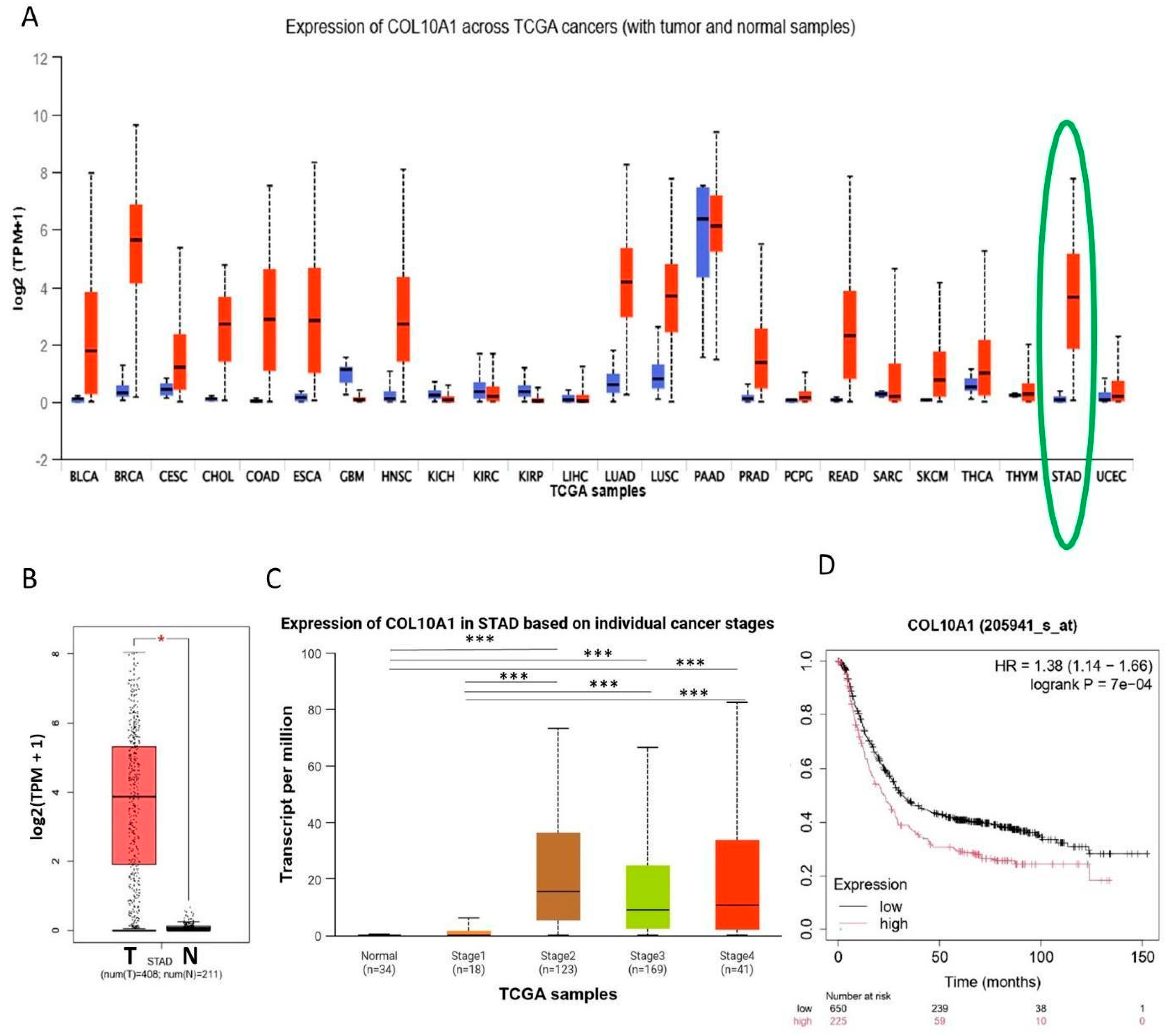 - Necula, L.; Matei, L.; Dragu, D.; Pitica, I.; Neagu, A.I.; Bleotu, C.; Dima, S.; Popescu, I.; Diaconu, C.C.; Chivu-Economescu, M. High plasma levels of COL10A1 are associated with advanced tumor stage in gastric cancer patients. World J. Gastroenterol. 2020, 26, 3024–3033. [Google Scholar] [CrossRef] [PubMed]