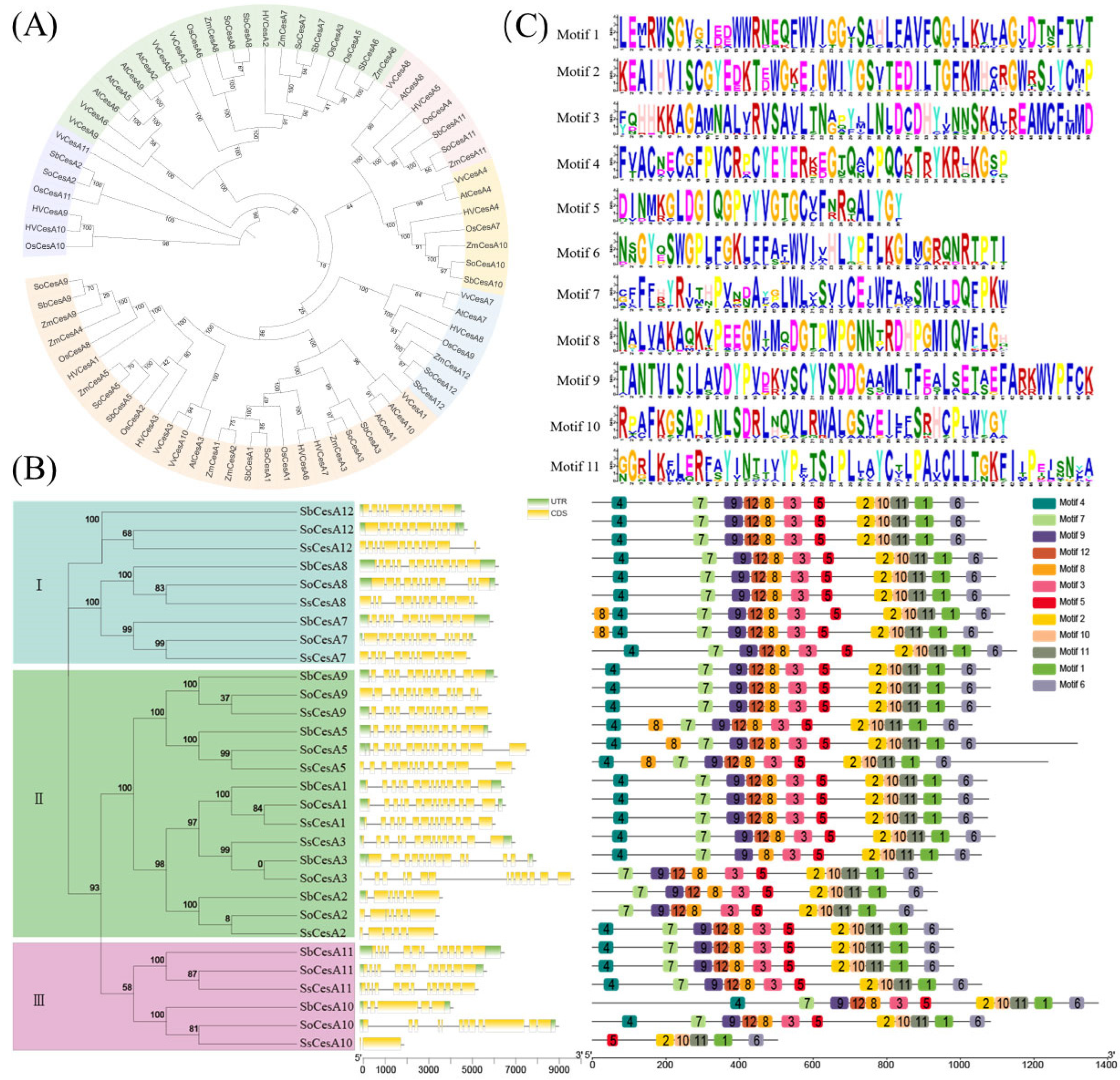 2.1. Genome-Wide Identification of CesAs Genes in S. officinarum