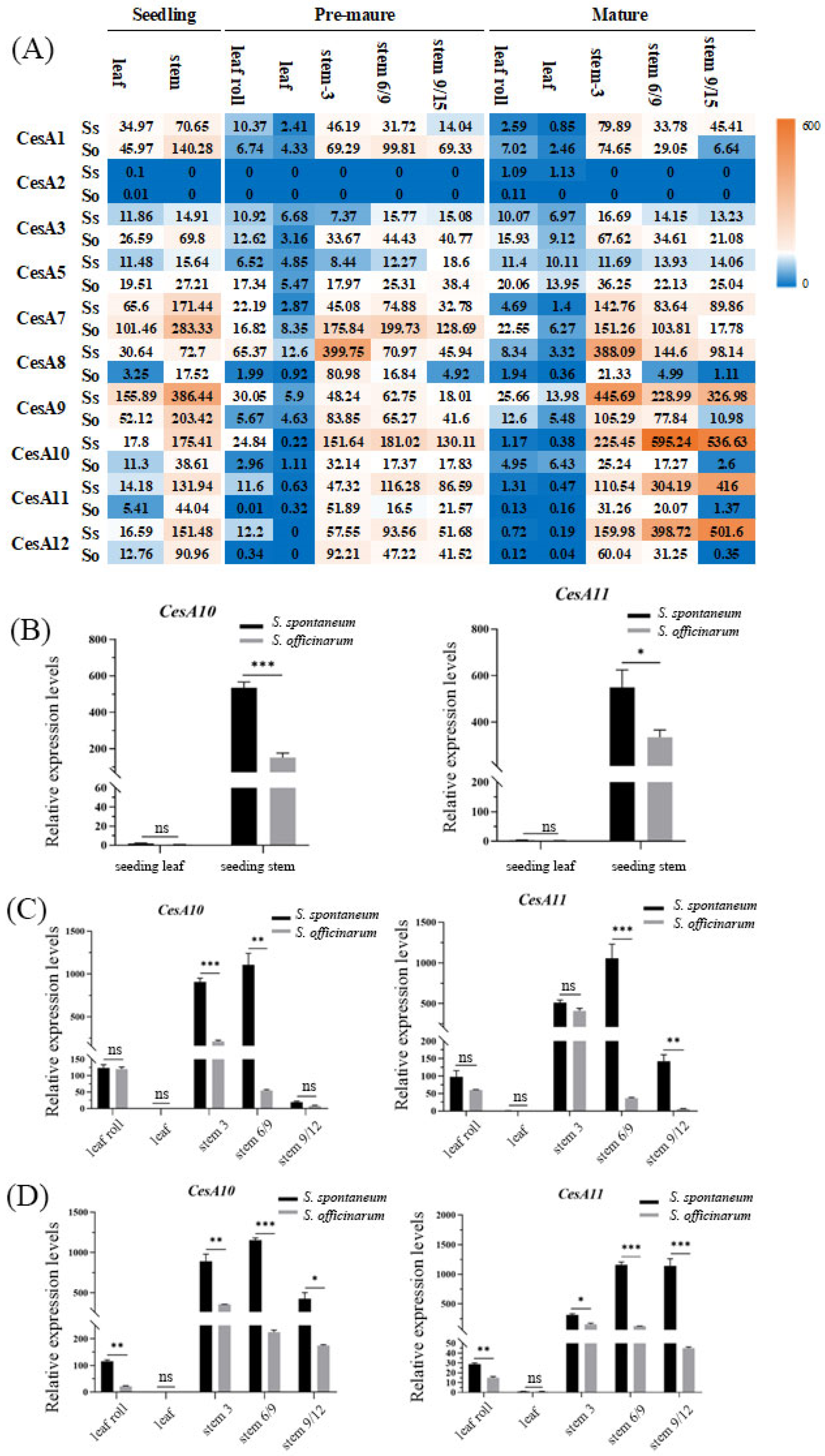 2.2. The Expression Patterns of CesA Genes at Different Developmental Stages in S. spontaneum and S. officinarum