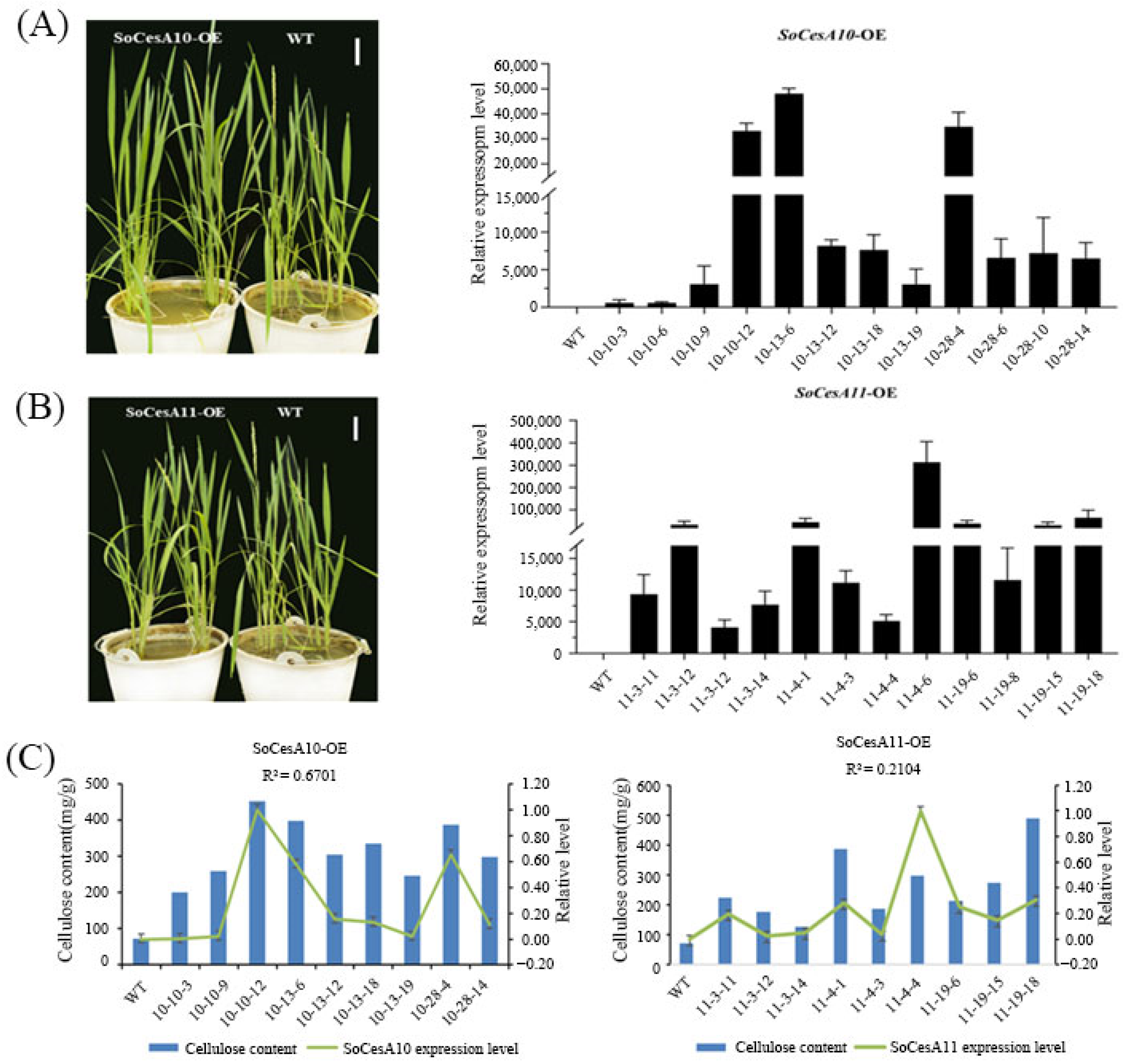 2.5. Genetic Transformation of SoCesA10 and SoCesA11 Genes in Rice