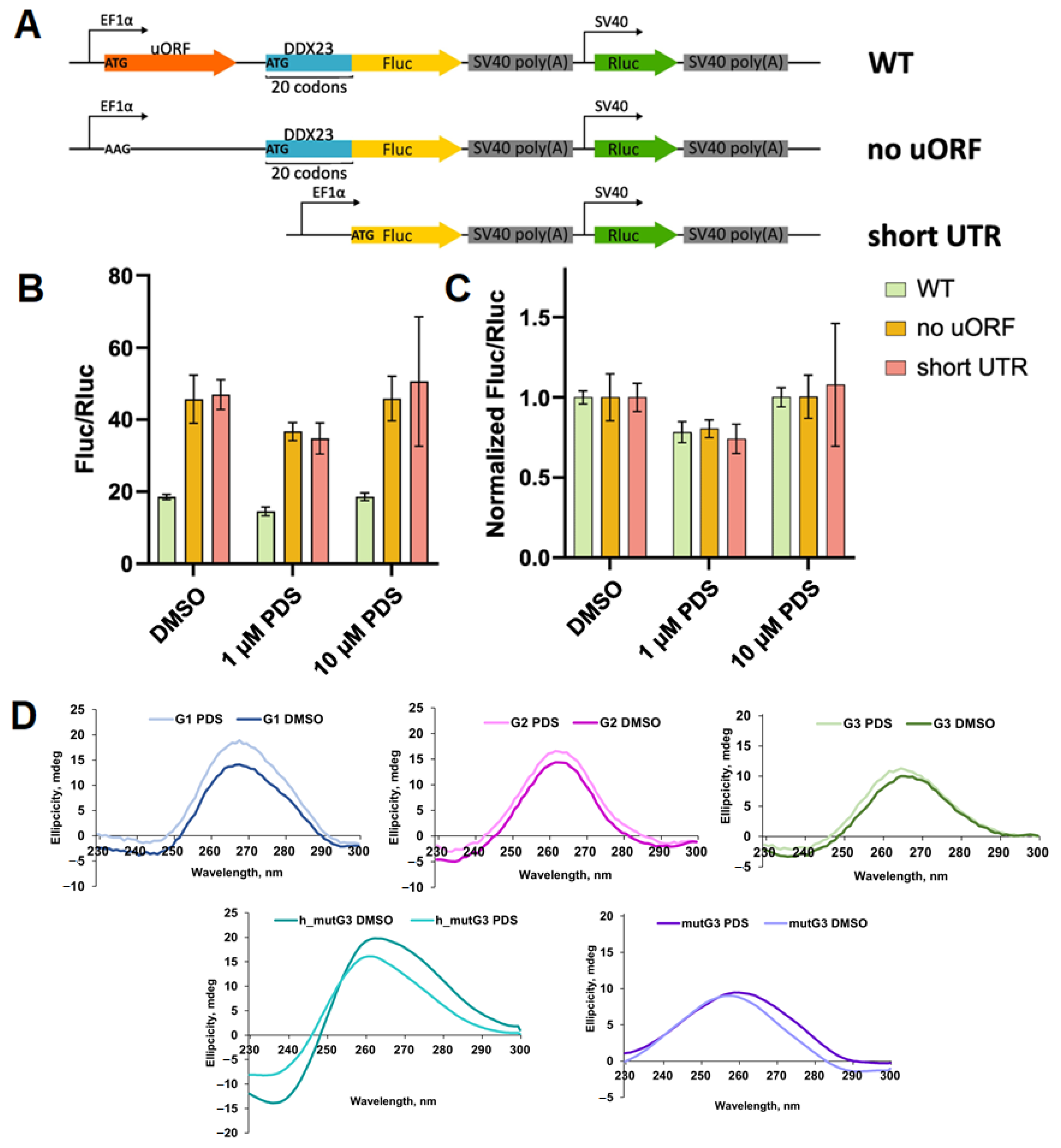2.1. Analysis of Potential Regulatory G-Quadruplex Elements in 5′ UTR of DDX23 mRNA