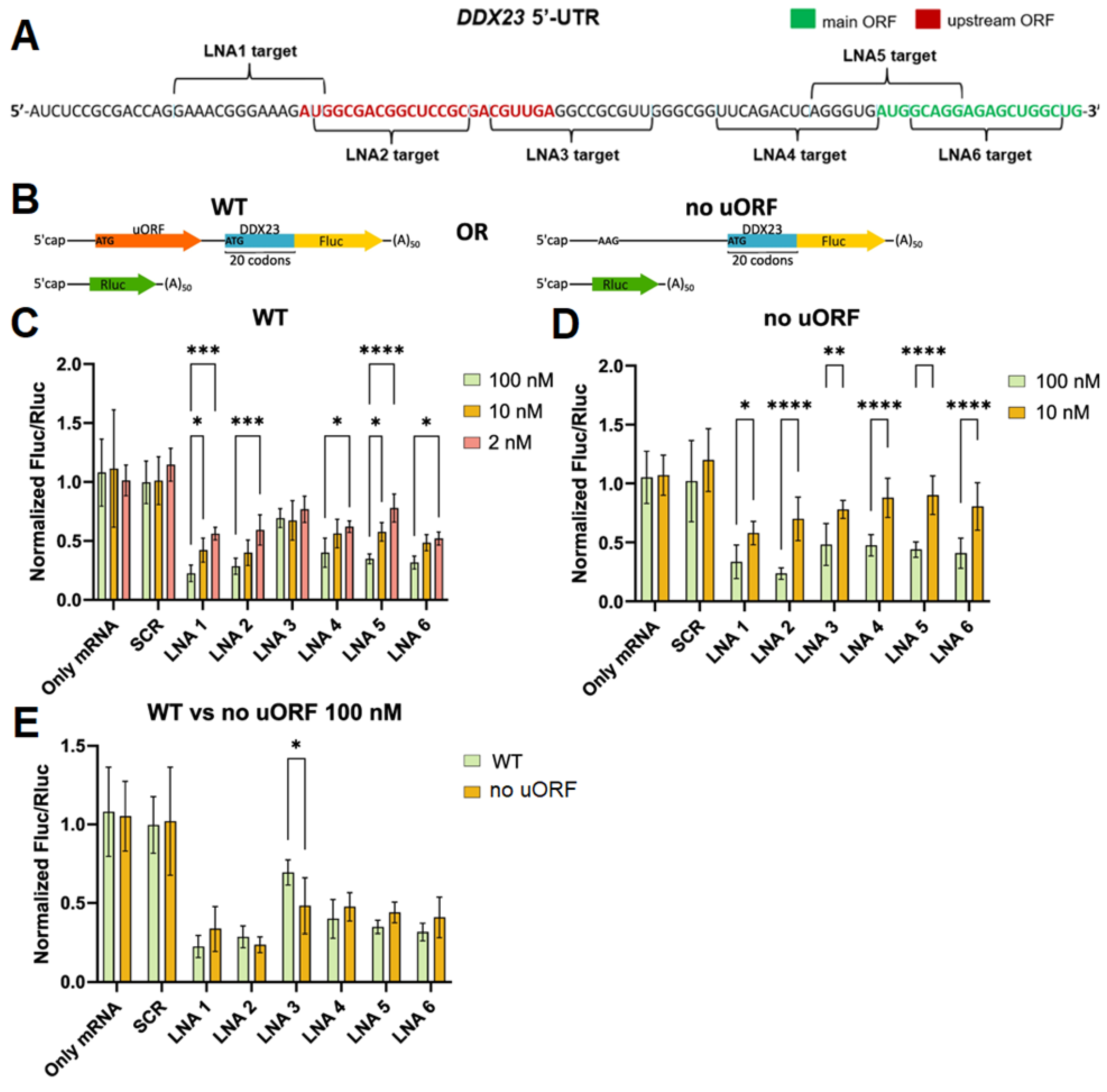 2.3. Evaluation of LNA-Based ASOs Activity in DDX23 5′ UTR Translation Control