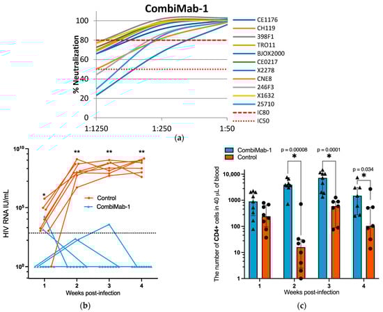 Protective efficacy of CombiMab-1 against HIV-1 infection in humanized mice. (a) Neutralizing activity of pooled sera from NMG mice treated with CombiMab-1 against a global panel of HIV-1 pseudoviruses. (b) Plasma HIV-1 RNA levels (IU/mL) in infected mice. Solid lines connect individual viral load values across time points for each mouse. The dashed horizontal line indicates the lower limit of quantification (LLOQ) for the RT-PCR assay (860 IU/mL). (c) Absolute counts of hCD4+ T cells in the peripheral blood of CombiMab-1-treated and control mice. Dots represent individual values; bars indicate medians; whiskers denote interquartile ranges. Statistical significance was determined using the Mann–Whitney U test. * p < 0.05, ** p < 0.01.