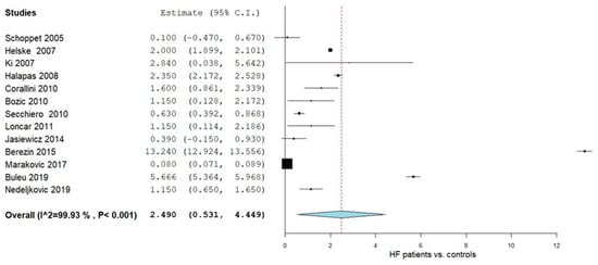 OPG levels were evaluated in a total of thirteen studies comparing values in HF patients with control subjects [,,,,,,,,,,,,]. Figure 2 summarizes the obtained meta-analysis results. The pooled analysis that assessed OPG levels in adult HF patients vs. control subjects showed an overall MD of 2.490 (95% CI 0.531, 4.449). Considerable heterogeneity was reported with an I2 = 99.93% and a p-value < 0.001.