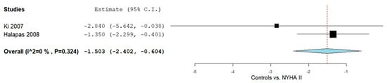 Subgroup analyses in adults were conducted to assess OPG levels across NYHA classifications relative to controls (Figure 3). For NYHA II patients, two studies [,] provided relevant data. The pooled MD was −1.503 (95% CI: −2.402 to −0.604), with heterogeneity deemed negligible (I2 = 0%, p = 0.324)