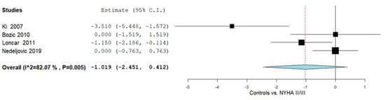 Further subgroup analyses were performed in adults to compare OPG levels between NYHA II/III HF patients and controls, as illustrated in Figure 4. Four studies [,,,] reported OPG measurements for this comparison. The pooled MD was −1.019 (95% CI: −2.451 to 0.412), indicating lower OPG levels in the patient group, accompanied by considerable heterogeneity across studies (I2 = 82.07%, p = 0.005).