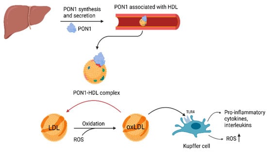 PON1 is a multifunctional enzyme that exhibits multiple enzymatic activities, including paraoxonase (hydrolysis of paraoxon), arylesterase (hydrolysis of aromatic esters) and lactonase (hydrolysis of lactones) [,,]. Its lactonase function gives the enzyme its antioxidant and anti-inflammatory properties by breaking down lipid peroxides present in lipoproteins such as LDL [,]. Oxidative stress, a central factor in the development of MASLD, leads to the oxidation of LDL (oxLDL) through the action of reactive oxygen species (ROS) [,]. Oxidized LDL triggers Toll-like receptor signaling pathways, particularly TLR4 in Kupffer Cells (KCs), which results in the release of pro-inflammatory cytokines, interleukins and additional ROS [,]. PON1, which is associated with HDL in the bloodstream, hydrolyses oxLDL, converting it back into LDL (Figure 3) []. Through this mechanism, PON1 serves as a protective agent, mitigating oxidative stress and inflammation [,].