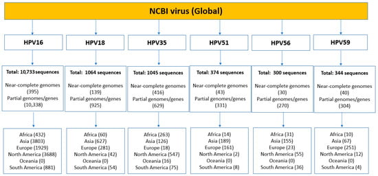 Flow diagram showing the data collection and sorting procedure for the study. Nucleotide sequences of six HR-HPV types (16, 18, 35, 51, 56, and 59) from different regions of the world were retrieved from the NCBI Virus database.