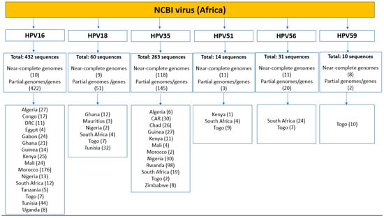 Full-length E5, E6, E7, and L1 gene sequences of HR-HPV types in Africa retrieved from the NCBI Virus Database.