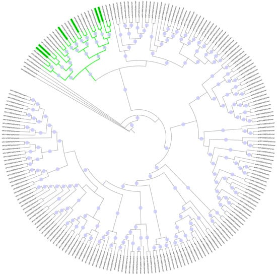 Maximum likelihood tree topology of 222 HR-HPV reference genomes. Multiple sequence alignments were performed using MAFFT v7.525, and phylogenetic analysis was performed using IQ-TREE v2.0.7 with SH-aLRT/UFboot tests for 1000 replicates. Purple dots indicate branches with support values ≥ 70%, where larger dots represent relatively higher support values. HPVs 16, 18, 35, 51, 56, and 59 are highlighted in green and cluster within the same monophyletic clade.