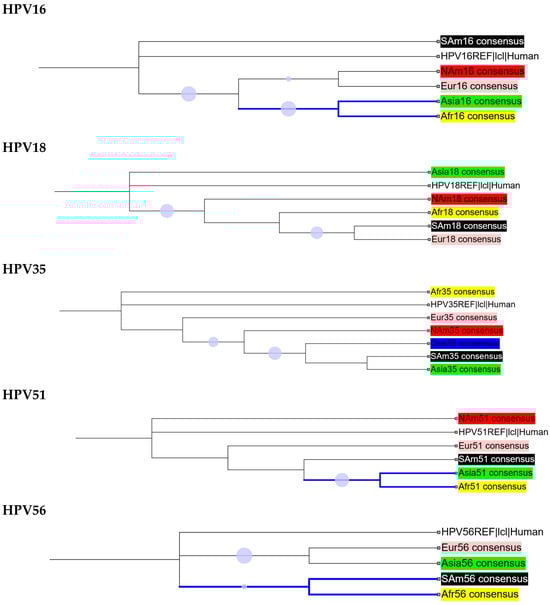 Maximum likelihood tree topologies of HR-HPV consensus sequences from different regions of the world. Multiple sequence alignments were performed using MAFFT v7.525, and phylogenetic analysis was conducted using IQ-TREE v2.0.7 with SH-aLRT/UFboot tests for 1000 replicates. Purple dots indicate branches with support values ≥70%, with larger dots representing relatively higher support values. Branches showing notable clustering are shown in blue.