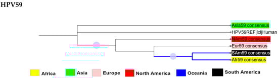 We compared the genetic diversity of HR-HPV consensus sequences from different regions of the world, as shown in Figure 3 (further detail is presented in Supplementary Figure S1 and Table S1). Based on the cladograms of regional consensus sequences, HPV16 and HPV51 populations from Asia and Africa were found to be closely related. Similarly, the African HPV56 and HPV59 populations showed a close relationship with their counterparts in South America.