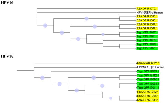 Maximum likelihood tree topologies of near-complete (≥80%) genomes of HR-HPV isolates from countries across Africa. Multiple sequence alignments were performed using MAFFT v7.525, followed by phylogenetic analysis using IQ-TREE v2.0.7 with SH-aLRT/UFboot tests for 1000 replicates. Purple dots represent branches supported by values ≥ 70%, with larger dots indicating relatively higher support. Branches showing notable clustering in HPV35 are shown in blue.