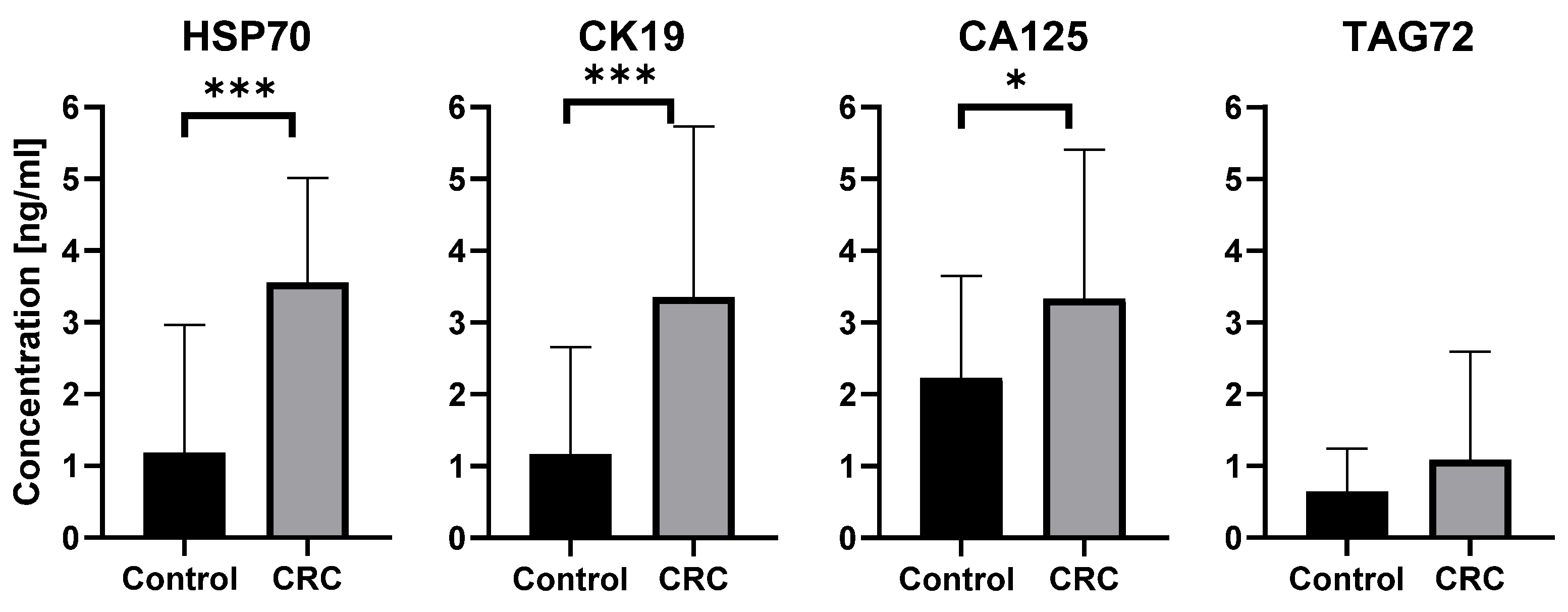 2.4. Quantitative Analysis of Exosomal Markers of Colorectal Cancer