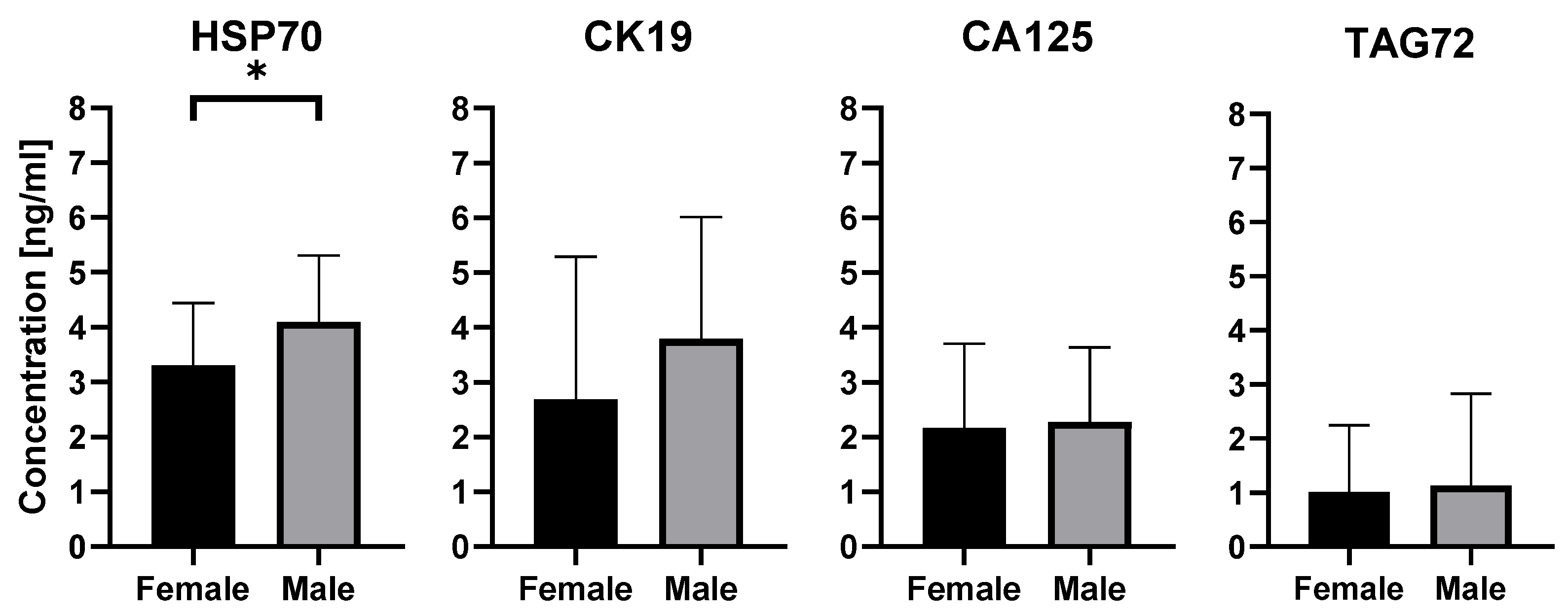 - Chanteloup, G.; Cordonnier, M.; Isambert, N.; Bertaut, A.; Hervieu, A.; Hennequin, A.; Luu, M.; Zanetta, S.; Coudert, B.; Bengrine, L.; et al. Monitoring HSP70 exosomes in cancer patients’ follow up: A clinical prospective pilot study. J. Extracell. Vesicles 2020, 9, 1766192. [Google Scholar] [CrossRef]