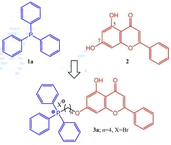 Triphenylphosphine (1a), chrysin (2), and one of the chrysin–TPP conjugates (3a) planned for synthesis.