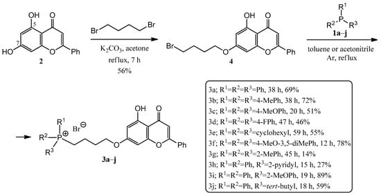 Then, the alkylated chrysin derivative (4) was reacted with corresponding phosphines (1a–j) in toluene (a–e,h) or acetonitrile (f–g,i–j) solvent (Scheme 1). The solution was refluxed under Ar atmosphere until the starting materials were consumed (for 12–59 h). The crude products were purified by preparative TLC, obtaining the expected phosphonium salts (3a–j). The yields were in good agreement with expectations, as the P-alkylations were carried out in good yields with phosphines containing electron-donating groups (e.g., 1f, 78%, the P atom is more nucleophilic), while phosphines substituted with electron-withdrawing groups (e.g., 1d, 46%, the P atom is less nucleophilic) or substituted in the ortho position (1g, 14% steric hindrance) resulted in poorer yields.