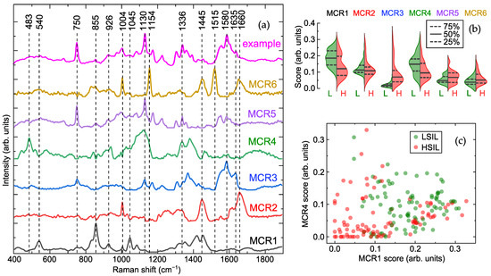 Results of multivariate curve resolution (MCR) analysis: (a) example of acquired Raman spectrum and six components obtained by MCR analysis with their major Raman bands, (b) half-violin plots indicating scores of these components for low- (LSIL, L) and high-grade squamous intraepithelial lesion (HSIL, H) samples with median (50%) and quartile (25%, 75%) levels, and (c) distribution of scores for first (MCR1) and fourth (MCR4) components.