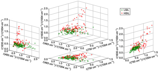 According to the results of the tests, three best spectral ratios were identified as , and . These ratios collectively provided an overall true positive rate (TPR) of 82%, with a specificity of 86% (90% for the training set) and sensitivity of 80% (fixed value). The peak at 483 , present in the glycogen-associated MCR4 component [14,36,37,38], resulted in a higher ratio for LSIL samples, as confirmed by distribution analysis (Figure 2). The band at 750 , linked to the CH–N–C breathing stretch in porphyrin rings, served as a blood marker in HSIL samples [39]. The ratio was primarily influenced by heme proteins (band at 1635 [33]), with minimal contribution from the Amide I protein band [40] due to normalization at 1004 .