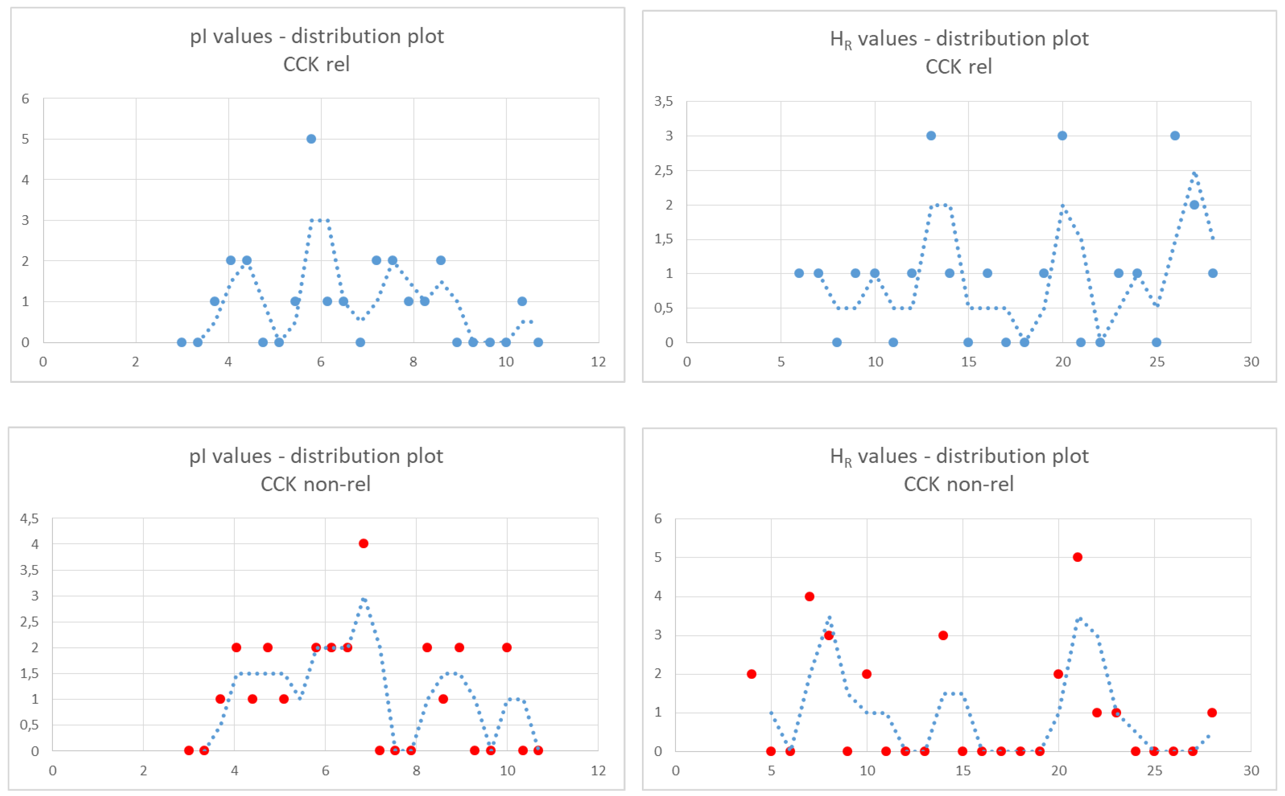 R values showed a greater number of values lower than 10 in the inactive peptide group versus a greater number of values higher than 25 in the active peptide group, suggesting that a marked hydrophobicity of a five- to eight-amino-acid-long peptide might be a positive marker of CCK-releasing activity (