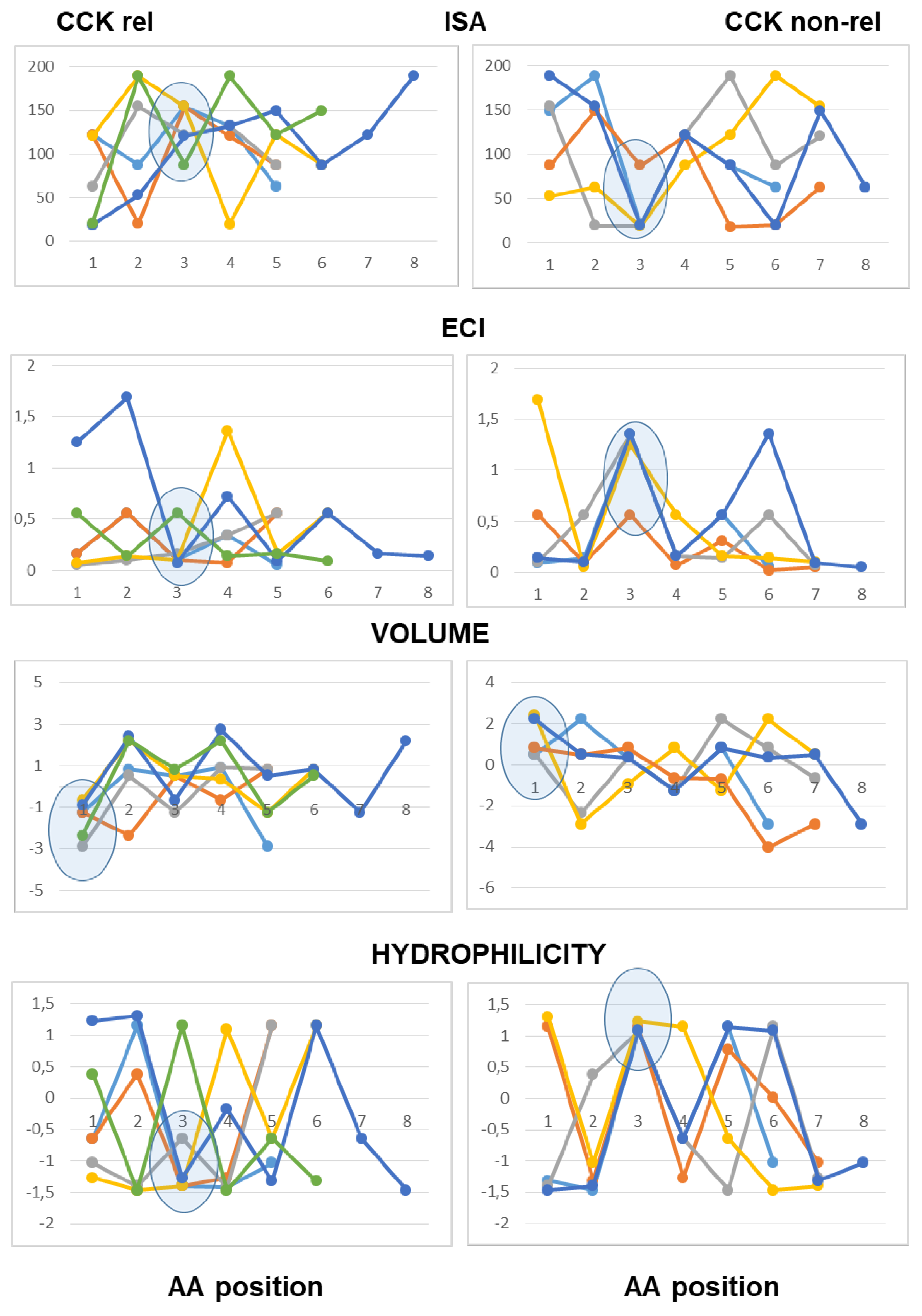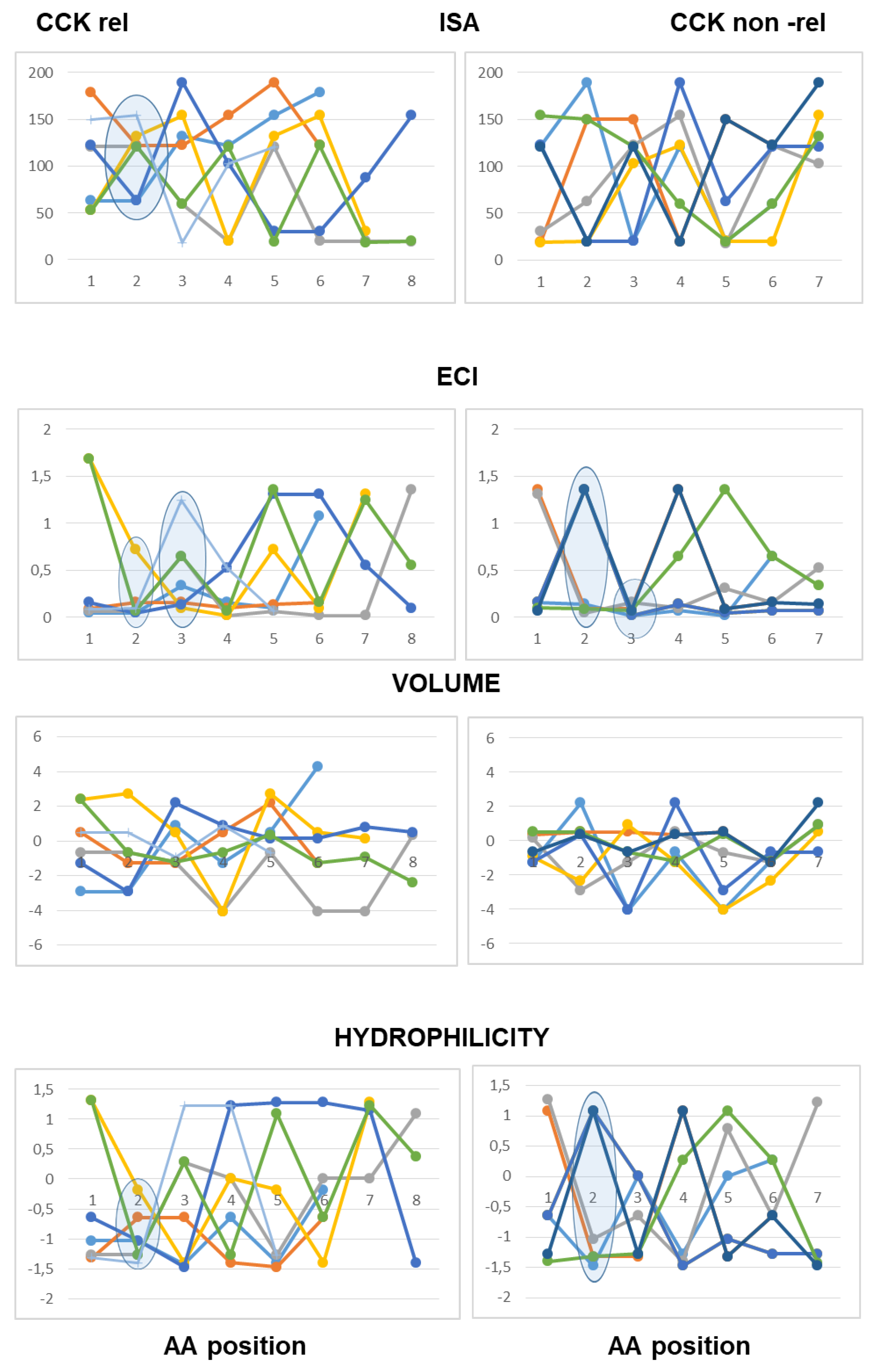 As to the acidic peptides (pI lower than 5.0), the comparison of the line graphs obtained using the Barley scalar descriptors suggested remarking on some peculiar traits that may contribute to differentiating active and inactive peptides. The volume values varied over a wider range in the inactive peptide sequences compared to the active peptide sequences. Specifically, the insertion of tiny amino acids (L-Gly, L-Ala and L-Ser) along the sequence was related to lack of CCK-releasing activity. Moreover, according to both scales of descriptors, the presence of amino acids with large hydrophobic side chains (aromatic or aliphatic) at position 2 from the N-terminal end was required to confer CCK-releasing activity, in that small side chains and/or hydrophilic side chains at the second position were seen only in inactive peptides. Of course, this trait was not enough to confer activity (