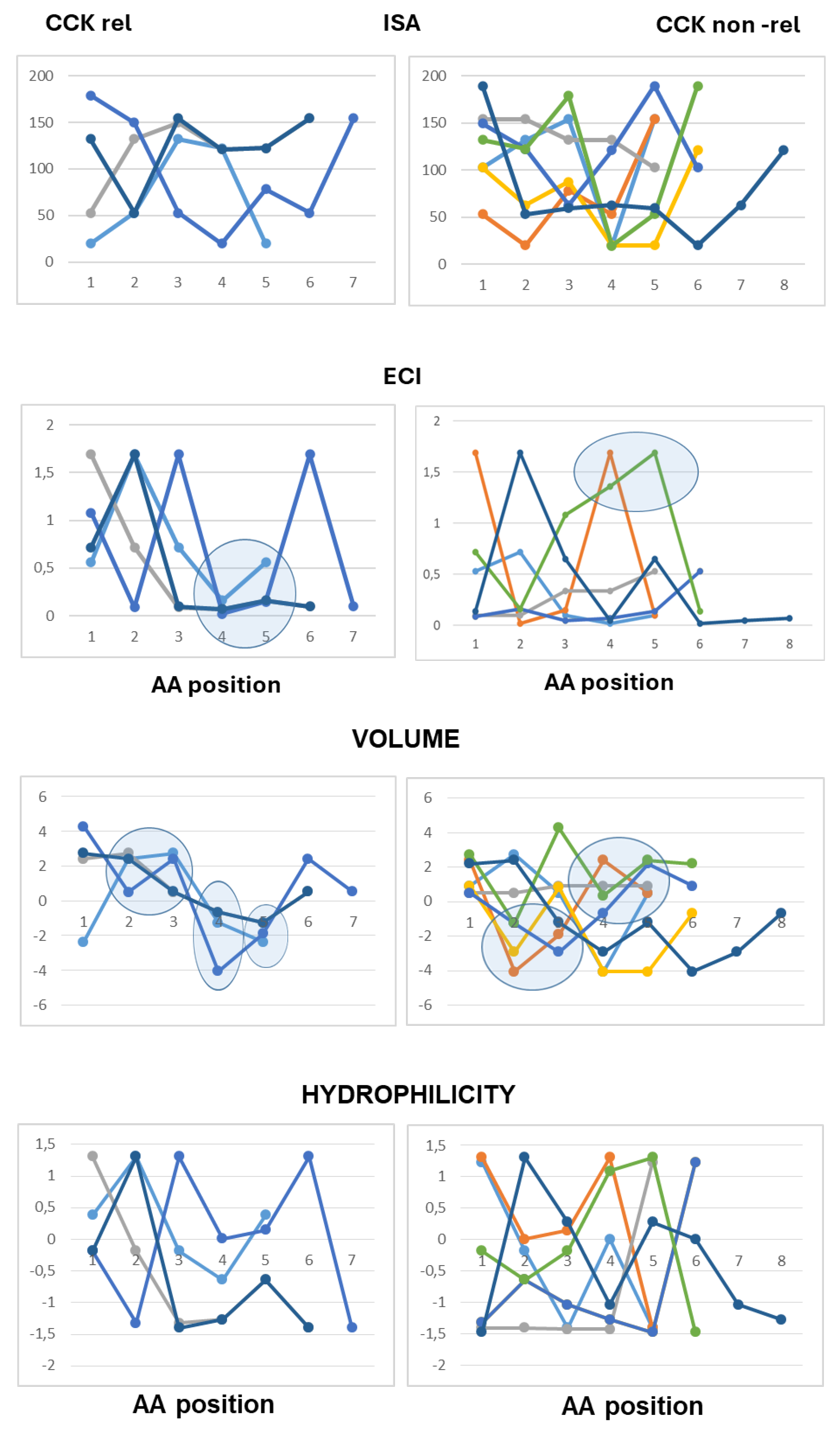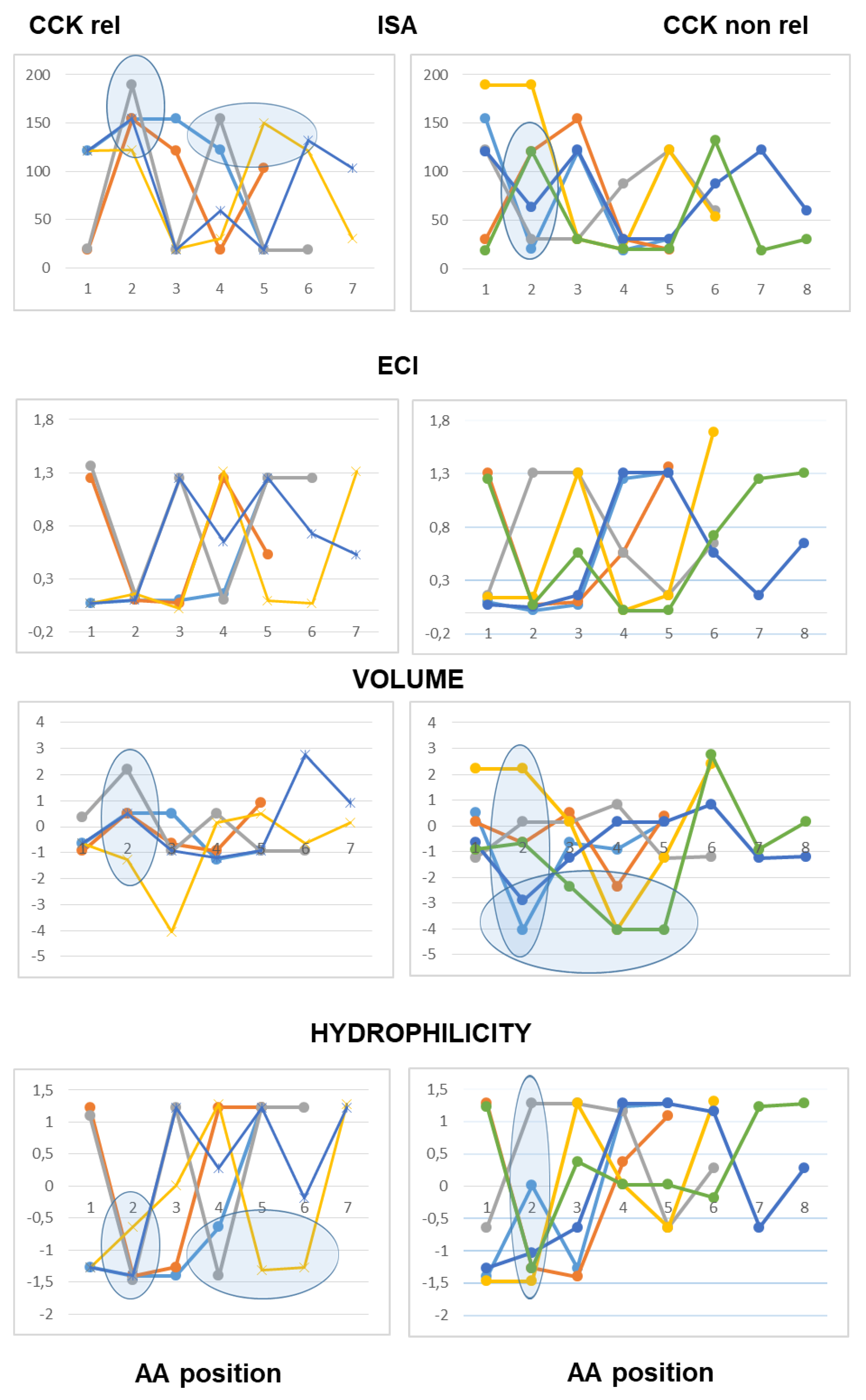 As to basic peptides (pI higher than 8.0), four active peptide sequences were available versus seven inactive peptide sequences. The comparison of the line graphs obtained using both scales did not suggest any differential trait related to the hydrophobicity of the amino acid residues between the two groups, in that the scalar descriptor values varied over a wide range from position 1 to position 5 in both active and inactive peptide sequences. On the other hand, the Barley’s volume scalar descriptor varied over a narrow range at positions 2, 3, 4 and 5 of the active peptides, so that the line graphs suggested a peculiar structural feature linked to the molecular size of the amino acid side chains not seen in the inactive peptides: specifically, large amino acid side chains at both positions 2 and 3 followed by small or tiny amino acids at both positions 4 and 5. Finally, as to the Collantes and Dunn scale, the trend of ECI values along the amino acid sequence suggested that a high charge concentration of amino acid side chains at positions 1, 2 and 3 was a preferential character of active peptides, whereas a high charge concentration at positions 4 and 5 was related to a lack of activity. In other words, the presence of L-Arg (not so L-Lys), at or near the N-terminal end may be favorable to CCK-releasing activity, whereas L-Arg near to the C-terminal end makes the peptide basic, but it is unfavorable to CCK-releasing activity (