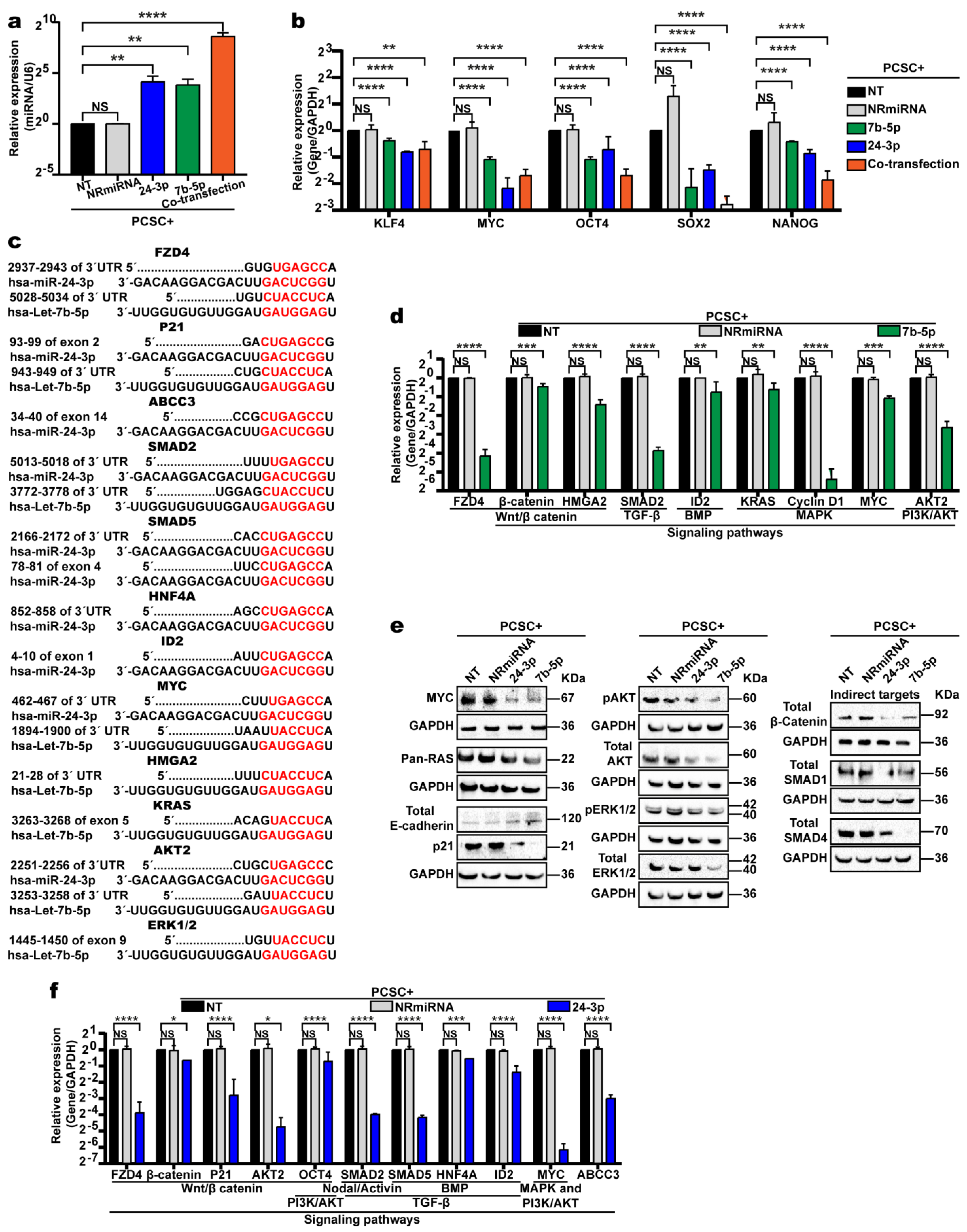 2.4. Overexpression of Let-7b-5p and miR-24-3p Reduces the Expression of Key Pluripotency Factors and Their Target mRNAs, Promoting the Differentiation of PCSCs