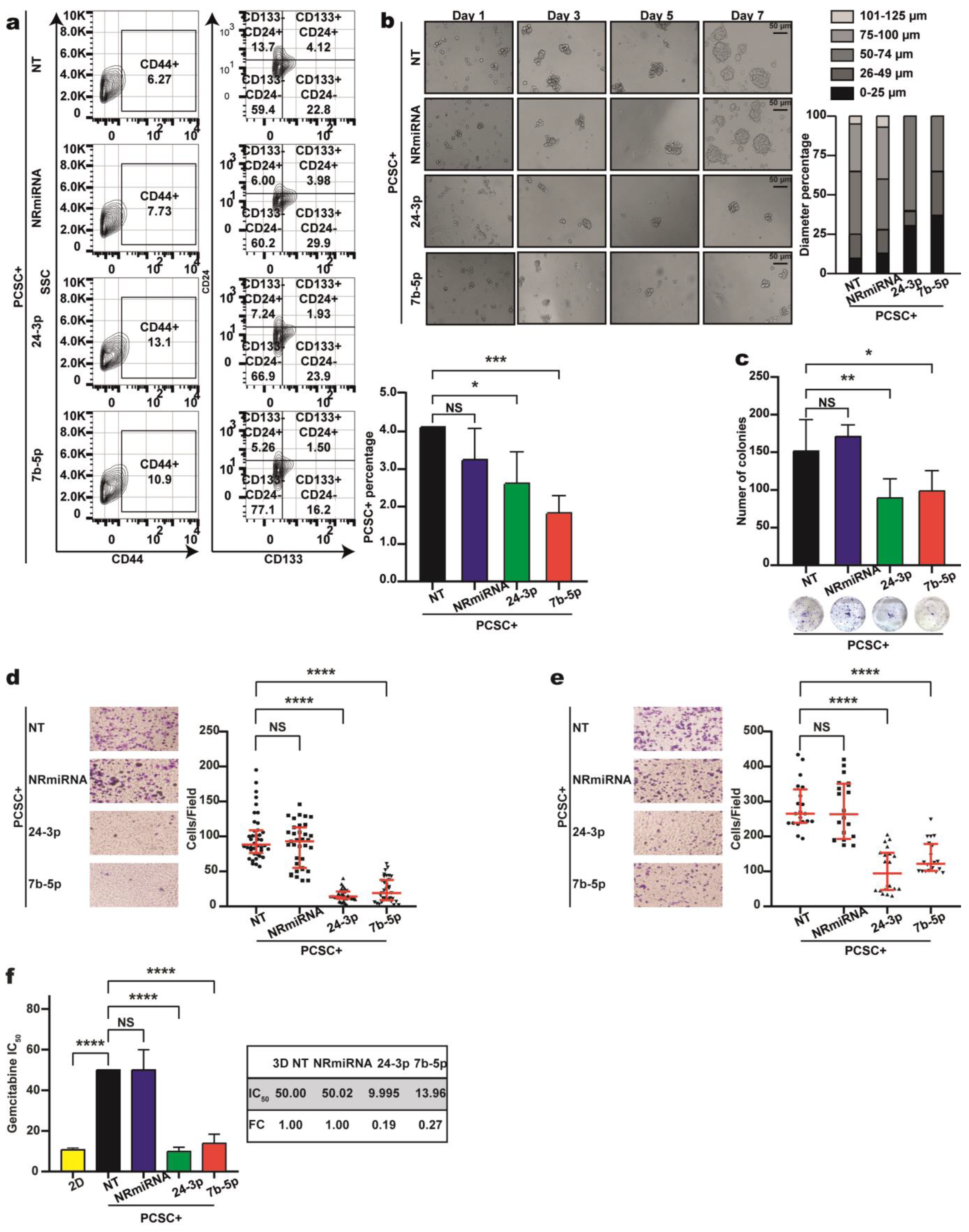 2.5. Overexpression of Let-7b-5p and miR-24-3p In Vitro Reduces the PCSC Population and Pancreosphere Size and Leads to Decreased Cell Proliferation, Invasion, Migration, and Resistance to Gemcitabine
