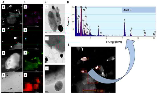 Analysis of S/TEM and EDX for the AgNaOPZr-Gr organic coatings employed in this study. S/TEM images 1–4 of AgNaOPZr-Gr particles at varying magnifications (A,B). S/TEM images 1–3 showing the shapes of nanoparticles at three different magnifications (C). The graph displays the spectrum of EDX elemental composition analysis for the area 3 of AgNaOPZr-Gr organic coating (D). EDX regions for the elemental analysis of AgNaOPZr-Gr. The analysed regions (1–4) of the organic coating AgNaOPZr-Gr particles are highlighted in red bold (E).