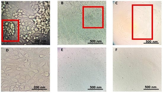 Inverted fluorescence microscopy images of the cell lines utilised for the cultivation of HCoVs-229E, OC43, and NL63. The red frames in figures (A–C) denote CPE, which refer to the observable morphological and degenerative alterations occurring 3–7 days post-infection by HCoVs (for instance, clumped cell aggregates or rounded host cells): (A) LLC-MK2 cell line infected with HCoV-NL63; (B) HCT-8 cell line infected with HCoV-OC43; (C) MRC-5 cell line infected with HCoV-229E. The uninfected cell lines are represented as follows: (D) LLC-MK2; (E) HCT-8; and (F) MRC-5.