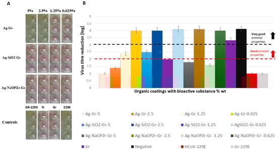 Results derived from the evaluation of antiviral activity of coatings utilising the colorimetric NRU-CPE assay. (A) An example of cut 96-well plates observed after a 7-day incubation period at 35 °C with 5% CO2; the coatings Ag-Gr, Ag-SiO2-Gr, and Ag-NaOPZr-Gr, which contain bioactive substances, were assessed at 5, 2.5, 1.25, and 0.625%. The blank colour of wells signifies no reduction in virus titer, while the pink colour of wells indicates a reduction in virus titer. (B) The graph displays the level of virus titer reduction, calculated as the average results from three independent trials and three technical replicates for each coating tested: Ag-Gr, Ag-SiO2-Gr, and Ag-NaOPZr-Gr at 0.625, 0.125, 2.5, and 5% wt. Lines on the graph indicate the antiviral properties’ level of assessed coatings under the ISO 21702:2019 EN standard []; red line indicates good antiviral properties (log ≥ 2); black line indicates very good antiviral properties (log ≥ 3) of tested organic coatings. The bars represent the standard error.