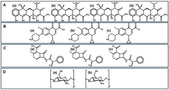 Tetracyclines are formed by an inflexible skeleton of four benzene rings, with many functional groups such as alkyl, hydroxyl, and amine on the upper and lower sides of the molecules (Figure 1A(a–d)). The presence of the amino group in the C4 position is crucial for antibiotic activities []. Tetracycline is characterized by three different pKa values (3.3, 7.7, and 9.7) and exhibits optimal antimicrobial activity in the pH range of 5.5–6.0 [], which can be justified by its zwitterionic structure. Although they have known adverse effects, including gastrointestinal disturbances and photosensitivity, tetracyclines continue to be widely prescribed due to their effectiveness against a broad spectrum of bacteria.