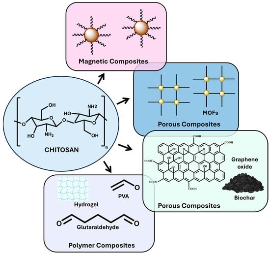 Below, we will describe and analyze the most relevant examples of the synthesis and application of chitosan-based matrices as adsorbents, as seen in Figure 2.