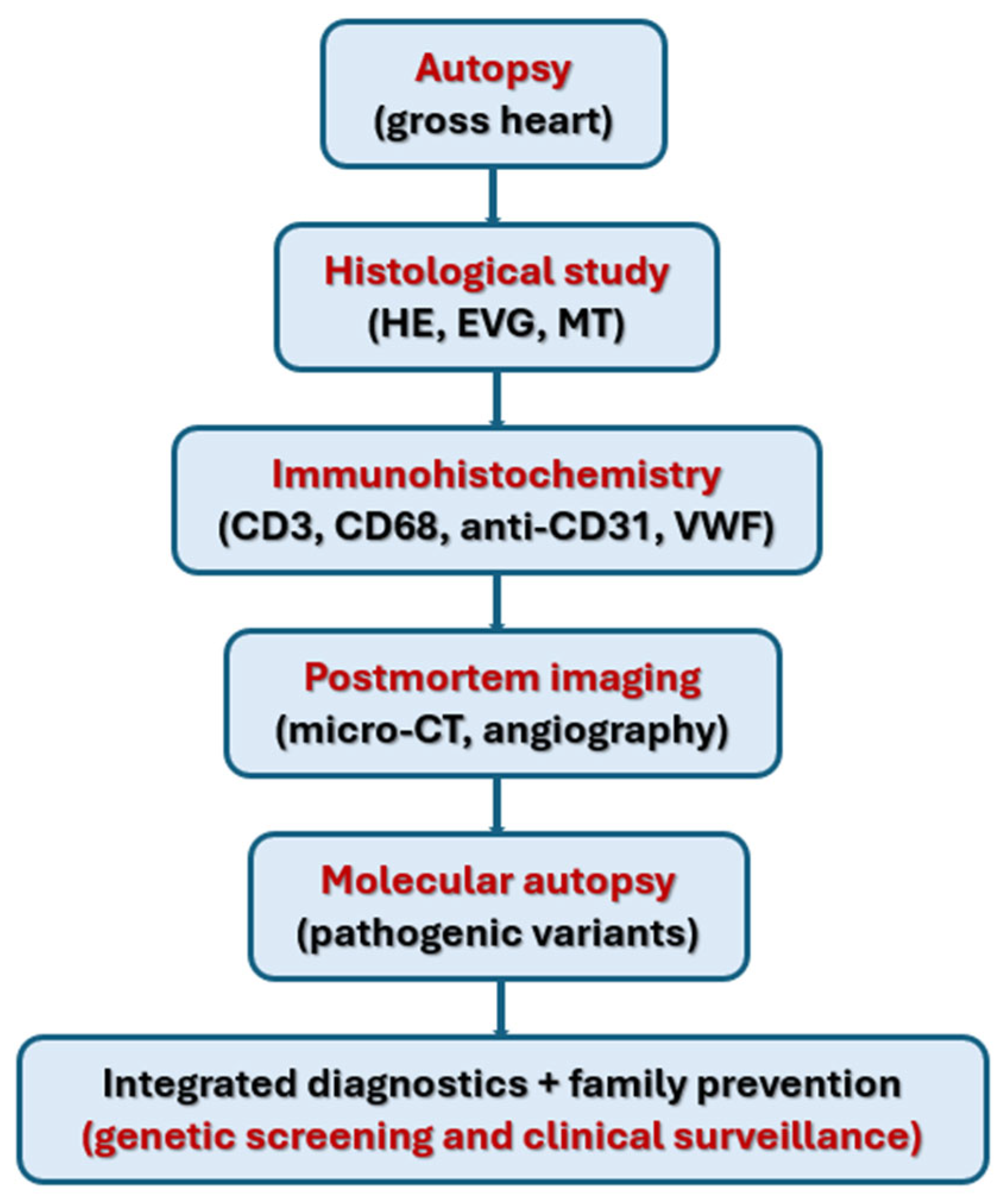 - Jenewein, T.; Beckmann, B.M.; Scheiper-Welling, S.; Kauferstein, S. Molekulare Autopsie—Postmortale genetische Diagnostik nach einem plötzlichen Herztod [Molecular autopsy: Post-mortem genetic testing following sudden cardiac death]. Inn. Med. 2025, 66, 970–978. [Google Scholar]
