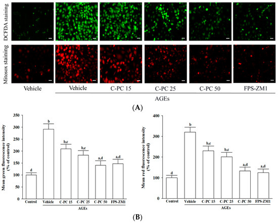 Effects of treatments on AGEs-induced oxidative stress in SH-SY5Y cells. Cells were pretreated with C-phycocyanin (C-PC) at 15 (C-PC 15), 25 (C-PC 25), or 50 (C-PC 50) μmol/L, or FPS-ZM1 (100 nmol/L) for 1 h prior to incubation with 300 μg/mL AGEs for an additional 24 h. (A) Representative fluorescence images illustrate intracellular ROS (upper panel), detected by DCFH-DA staining, and mitochondrial superoxide (lower panel), assessed by MitoSOX Red staining. Original magnification: 100×; scale bar: 100 μm. (B) Fluorescence intensity measurements were adjusted relative to total protein concentration, and results were expressed as a percentage of the untreated control group, which was defined as 100%. Data represent the mean ± SD from five independent experiments (n = 5), each performed in triplicate. a p < 0.05, b p < 0.01 vs. untreated control group; c p < 0.05, d p < 0.01 vs. vehicle-treated cells stimulated with AGEs.